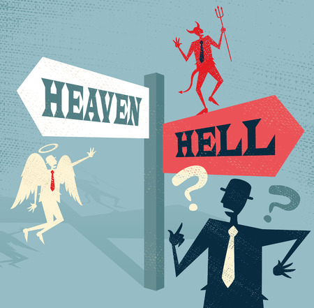 レトロの偉大なイラストは 困難な道徳的なジレンマをするために 天国と地獄両方の道標と天使と悪魔でビジネスマン スタイル のイラスト素材 ベクタ Image
